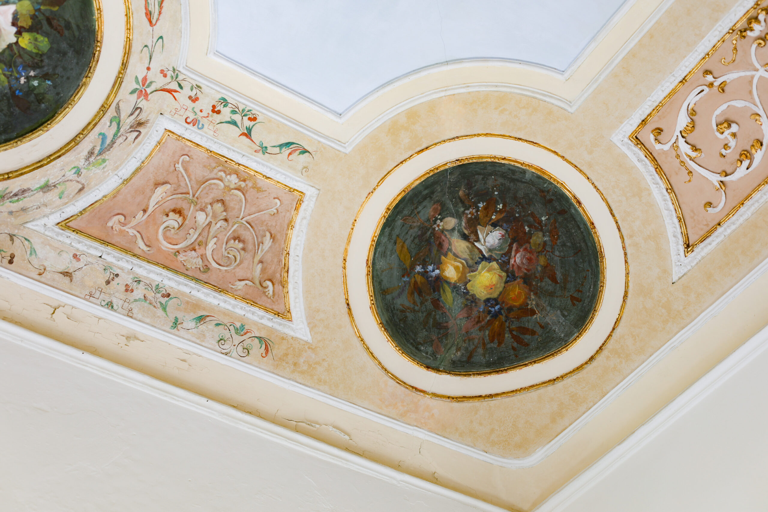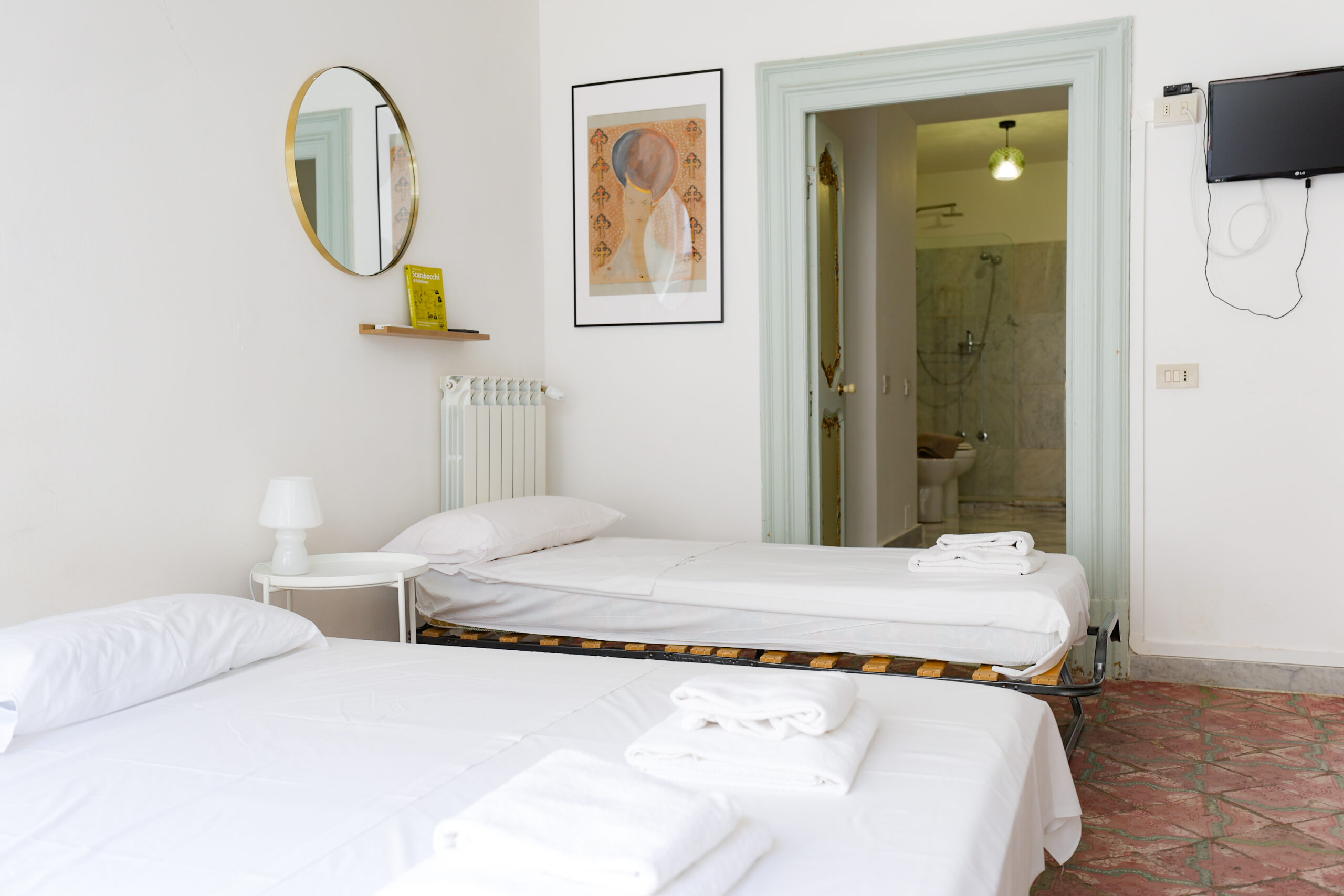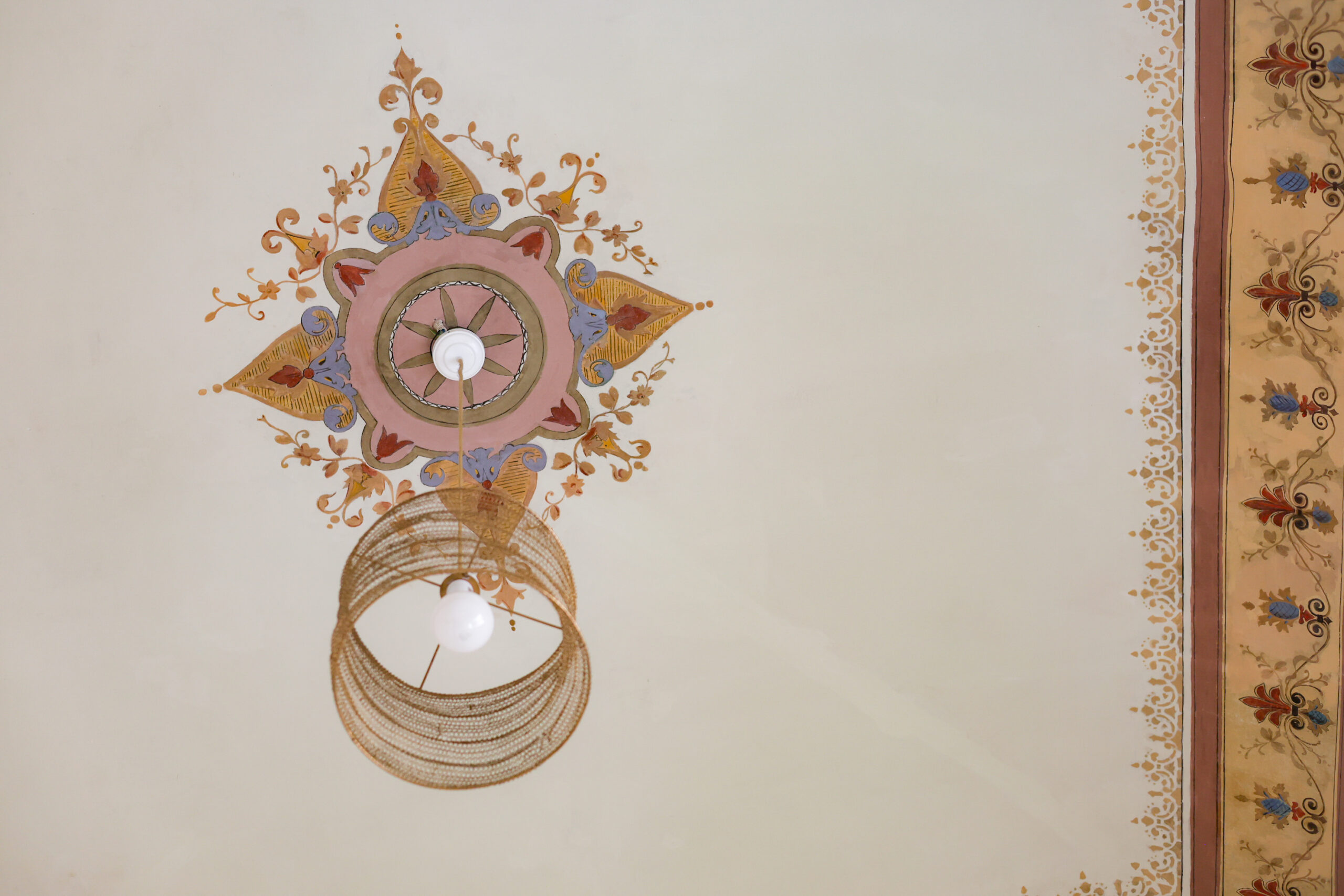 A spacious room with a beautiful ceiling, king size bed, private bathroom, and possible extra single bed.