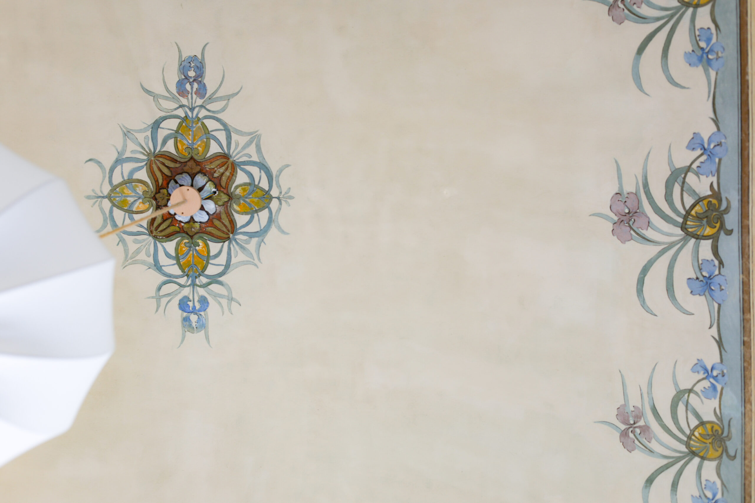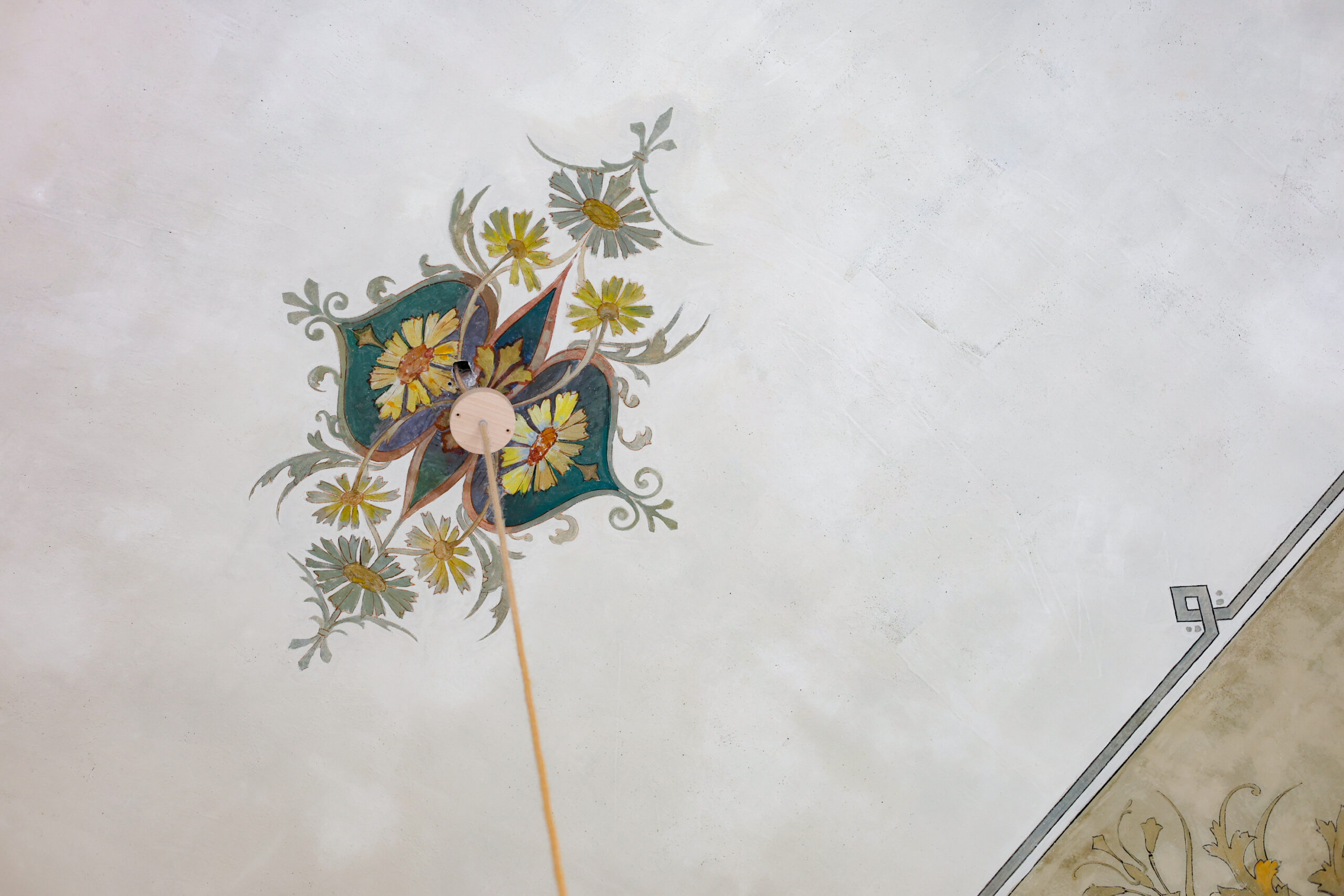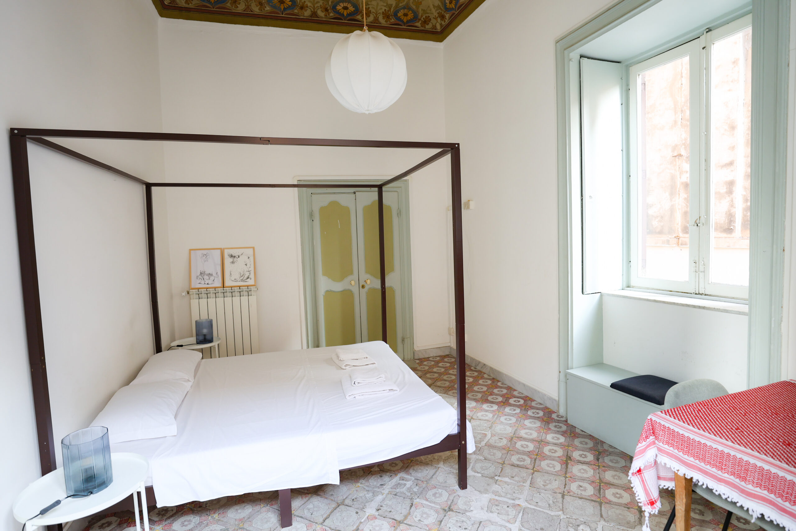 A spacious room with a beautiful ceiling, king size bed, private bathroom, and possible extra single bed.