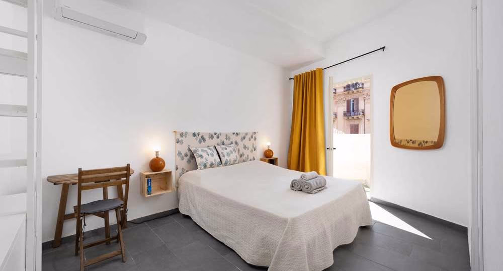 Bright room with private bathroom and a double bed, complete with a balcony and small desk.