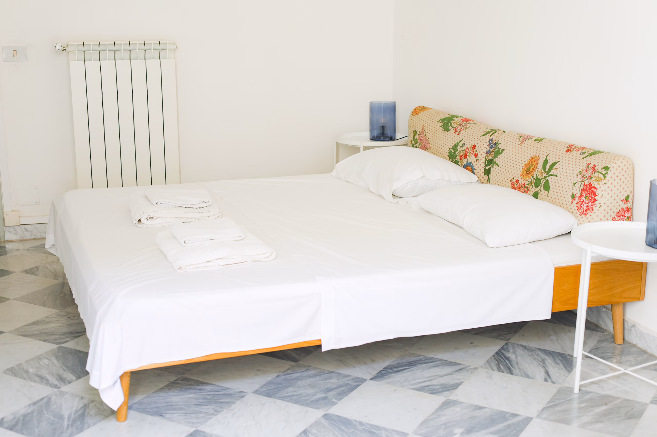 A spacious room with a beautiful ceiling, king size bed, private bathroom, and possible extra single bed.
